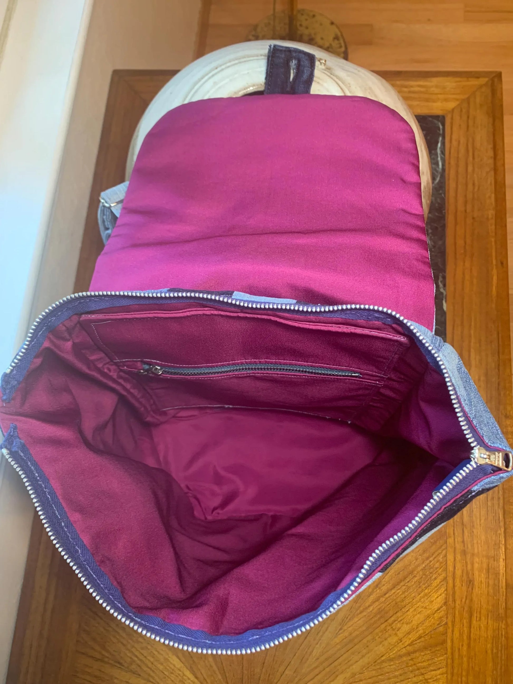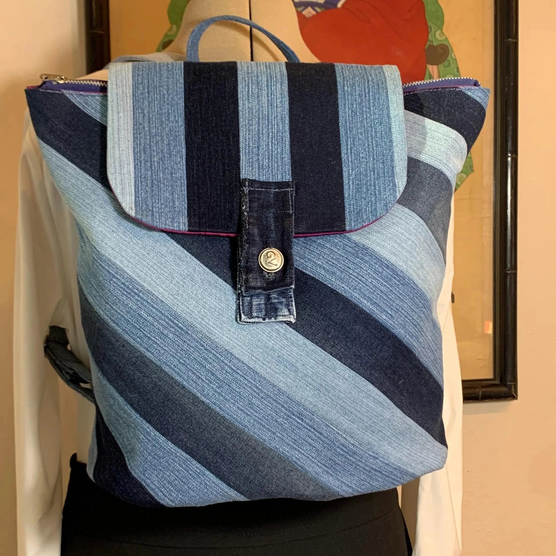 This backpack is handcrafted with recycled denim in a unique pattern of colors and cuts. It has a full lining made with a dark magenta fabric, and the closure is crafted from the waistbands of recycled jeans.