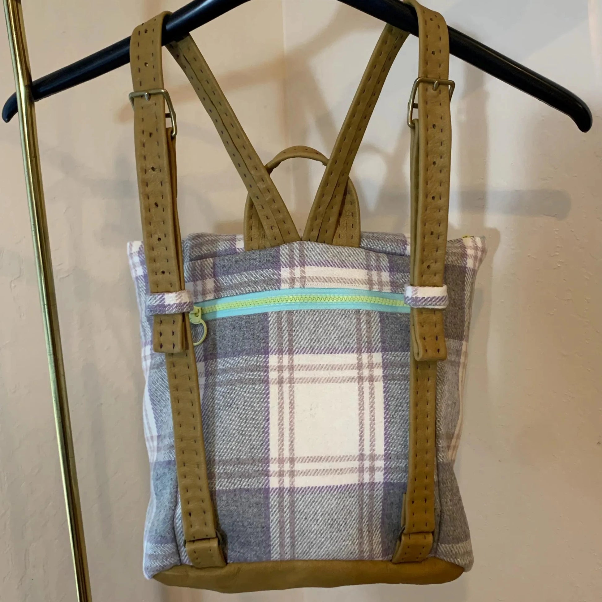 This backpack is made with hand-sewn leather on the straps and base and soft cream-based plaid fabric with accents of lavender and dusty rose. It has a full lining made with cream-colored satin, and the closure is crafted with a vintage brass button.