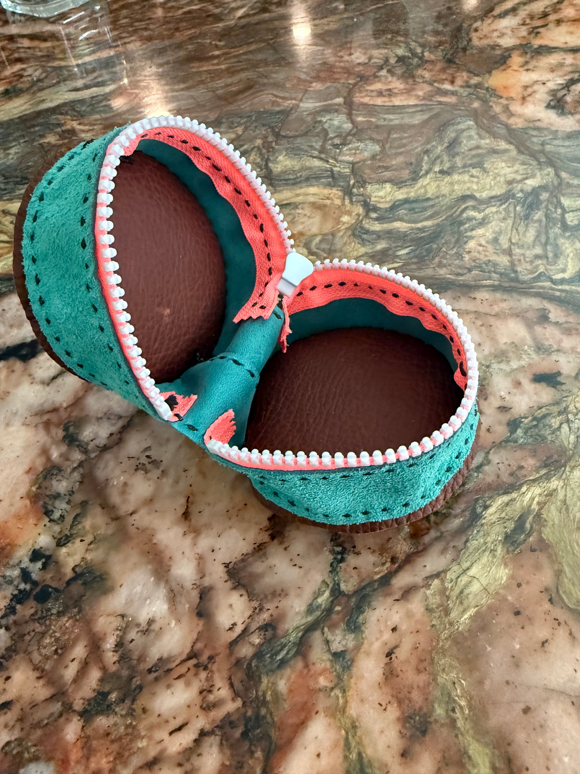 This travel Jewelry case is made out of teal and chocolate brown cow leather and is fully handsewn. The case is small enough to fit in the palm of your hand and is perfect for storing jewelry during travel or for other small items that need a safe place.